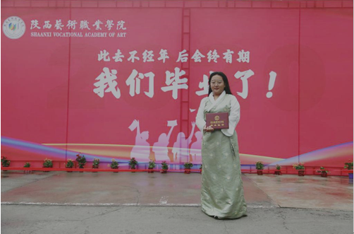 7月18日,久美曲忠身着特意从家乡青海玉树带来的藏族民族服装,手端毕业证书在陕西艺术职业学院毕业留言墙前,随着相机“咔嚓”声响,留下了自己人生中最难忘的一刻。