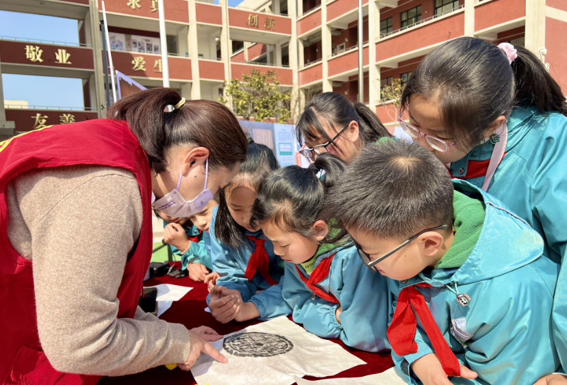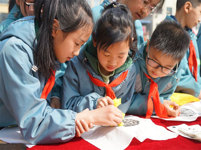 学生们在陕西历史博物馆志愿者的带领下进行拓片体验。杨瑾 摄