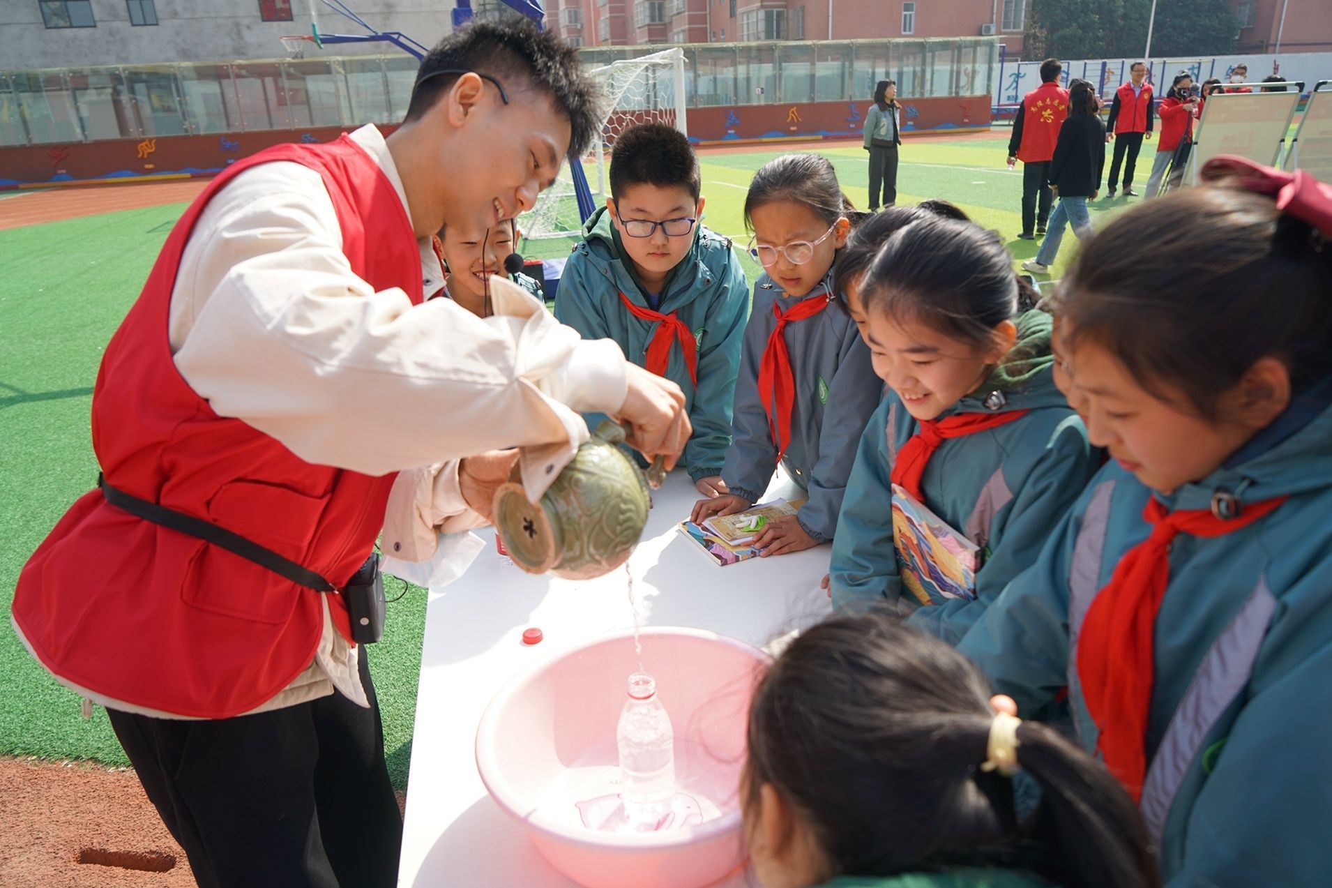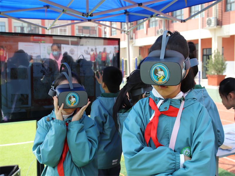 室外展区,志愿者通过倒流壶向学生演示了文物内藏的科技原理;文物知识展板前,孩子们在志愿者的精彩讲解下“云游”博物馆。孩子们在欢声笑语中参与文博科普知识互动、体验VR实景博物馆等项目。“我今天学到了很多历史知识,戴上VR眼镜仿佛进入了博物馆,今后我要好好学习,长大为祖国作贡献!”四年级(4)班学生胡欣彤说。