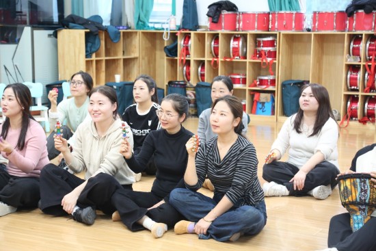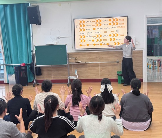 在第二模块中,孟小雨老师以奥尔夫“原本性音乐”理念为核心,从拍手、跺脚等自然节奏出发,引导教师进入生活化音乐体验。课堂中,教师们使用杯子、沙锤、响铃等简易乐器,在“杯子节奏”“魔法森林”等游戏中学习节奏与音色的变化。课程注重“低门槛、高参与、强互动”,既贴近县域园所实际,又展现音乐教育的开放性与可持续性,通过“动作节奏——音色认知——场景化设计”的教学思路,学员们掌握了将音乐教学融入日常生活的方式,使音乐活动成为情感与创造的桥梁。